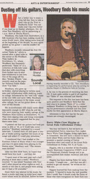 Greenfield Recorder Posted on October 8, 2009 by tom Wow, I got some great ink in the Greenfield Recorder today about Saturday’s show at Mocha Maya’s! Click on the newspaper image on the left for a larger, legible version.